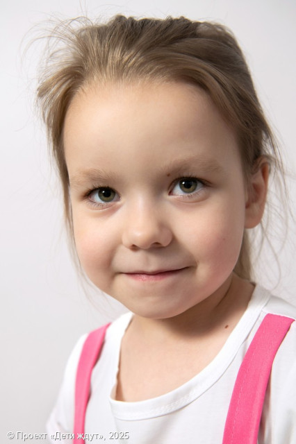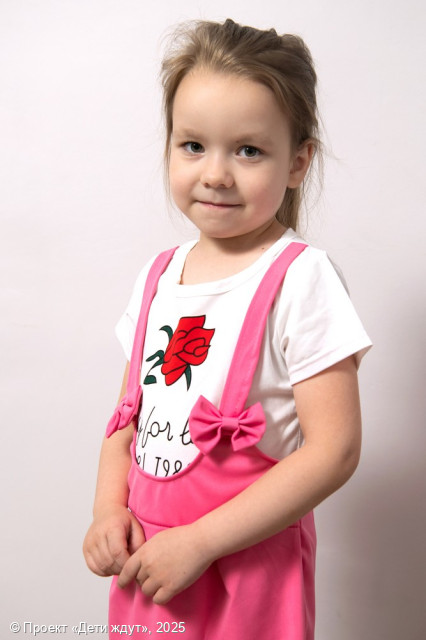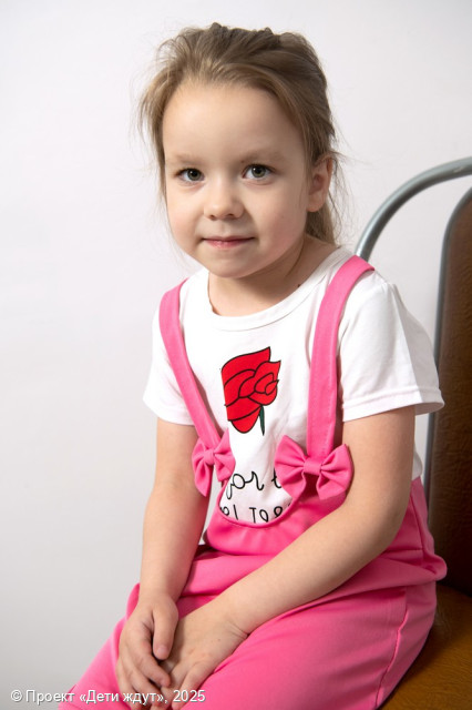 Арина — обаятельная, добрая и очень ласковая девочка. Она с лёгкостью идёт на контакт, быстро находит общий язык как с детьми, так и со взрослыми, и всегда искренне радуется новым знакомствам. Для Арины важны поддержка, похвала и внимание старших — это придаёт ей уверенности и вдохновляет на новые успехи. Девочка обладает хорошей памятью, умеет концентрироваться и с интересом берётся за новые занятия. Она любит, когда у неё всё получается, и с благодарностью принимает помощь и одобрение. Арина — спокойная и уравновешенная девочка, хорошо играет и общается с другими детьми. В свободное время она с удовольствием рисует, мастерит поделки из природных материалов, танцует и слушает музыку. Арина обожает подвижные игры, с азартом катается на самокате и роликах. Она аккуратна и уже самостоятельно следит за своим внешним видом, стараясь всегда выглядеть опрятно.